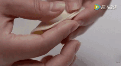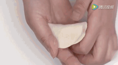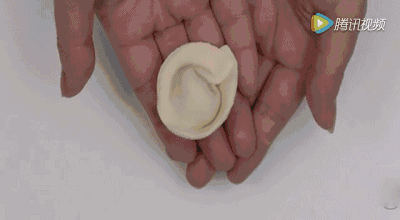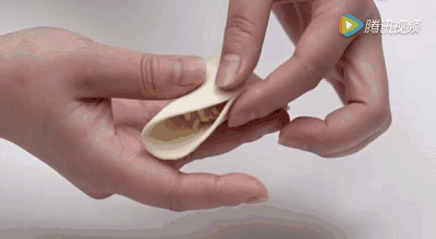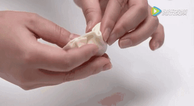 双手托住饺子皮,大拇指和食指对称