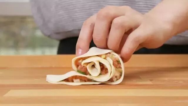 然后将饺子皮对折后依次卷起来