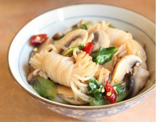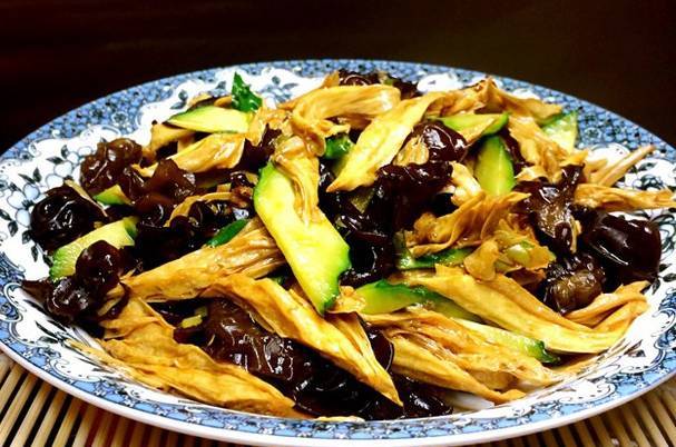 2.炒锅加油烧热,下蒜和姜片爆香,加腐竹翻炒一会,加黑木耳、盐、糖、生抽、胡椒粉、鸡精炒匀即可