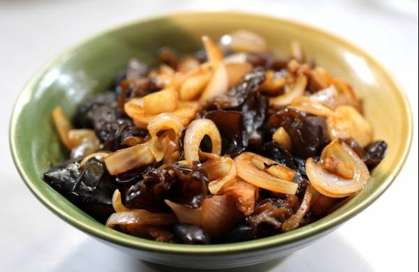 4.把黑木耳放锅里,和洋葱一起炒1分钟