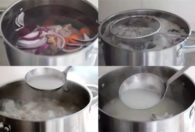 3.煮沸后从水面去除浮沫,直到汤变得清澈;搅拌,继续去除泡沫。这个过程可能需要几分钟。