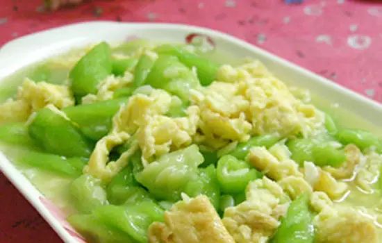 4.猛火将炒锅加热入油,待油温升高倒入丝瓜炒熟,加入已熟鸡蛋同炒,后按个人口味加入盐,葱花翻炒小会即可起锅食用。
