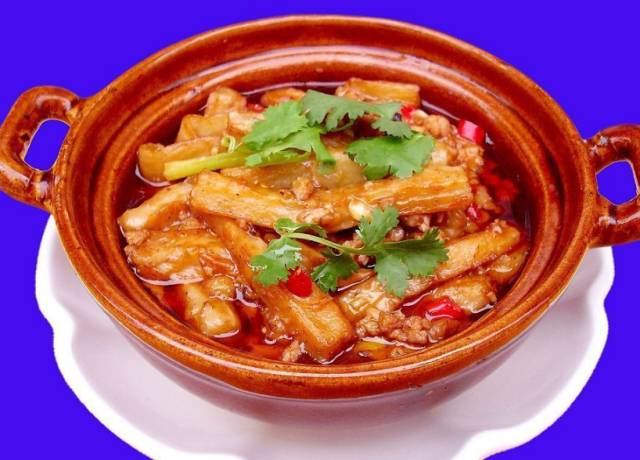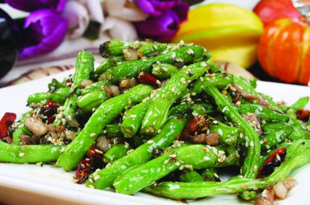 用料:扁豆400克,肉末150克 调料:干辣椒4个,老抽1大勺,榨菜末、花椒、蒜粒、盐、味精各适量