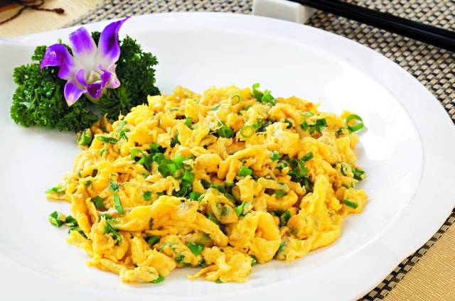 3.猛火将炒锅加热入油,待油温升高倒入鸡蛋炒熟盛碗备用。
