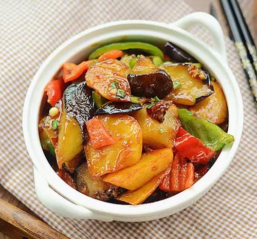 做 法: 1、茄子和土豆去皮,切成滚刀块;青椒手掰成小块。 2、锅中到入多一些的油,七成热时,先将土豆块放入,炸成金黄色,略显透明时捞出备用.。3、再将茄子倒入油锅,炸至金黄色,加入青椒块即一起捞起.。 4、以少量热油爆香葱花及蒜茸,加高汤、生抽、糖、盐、茄子、土豆和青椒块,略炒.。5、加入水生粉大火收汁即可