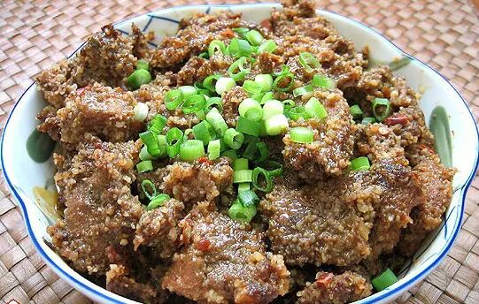 8、最后加入一大勺豆瓣酱。再加少许水,使粉湿润。